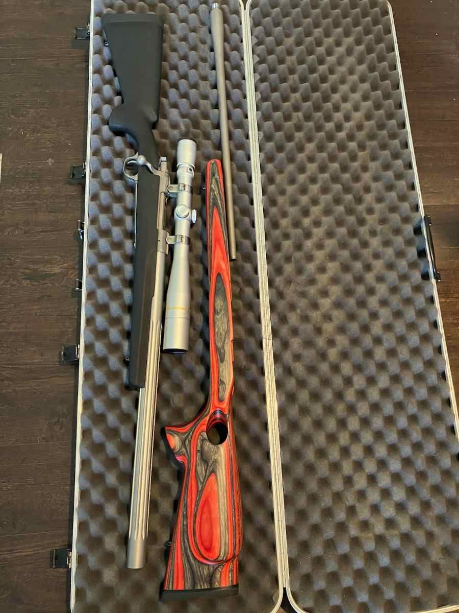 Ruger M77 Hawkeye 7MM Mag, Leupold VX3 6.5-20x40 Scope. This gun has two barrels, a precision bull barrel cable of hitting a basketball at 1000 yds. It includes the original rifle barrel and thumbole laminated stock. The synthetic stock was made and fitted for the bull barrel by Dan Hogue.(see photo). There are less than 30 rounds fired through each barrel.